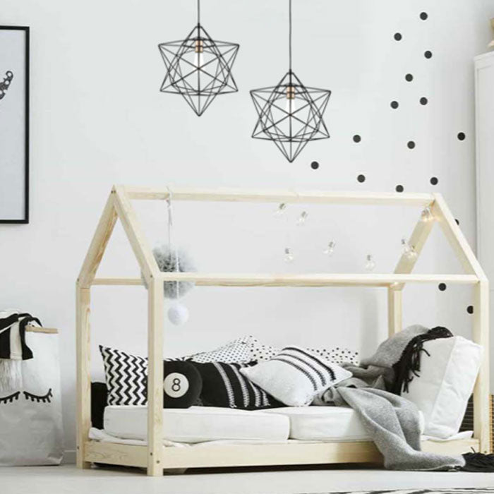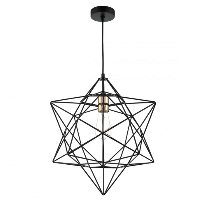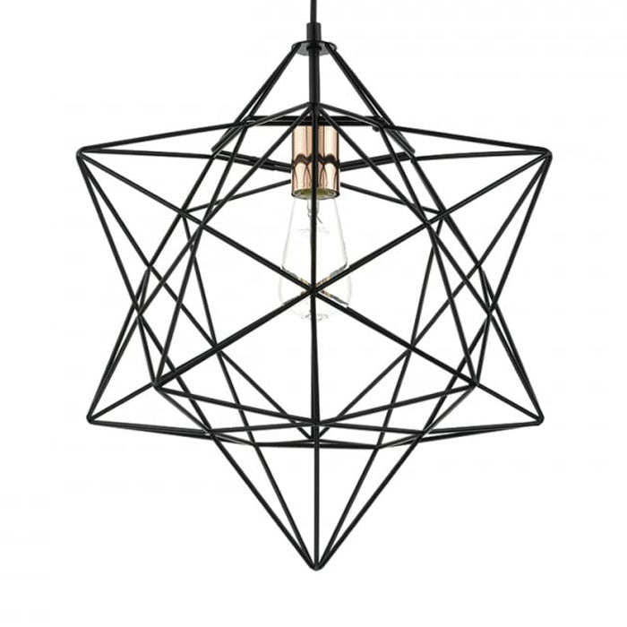 This unique pendant light is sure to add a fun designer look to your home. Crafted in an attractive star shape using a cross pattern, this pendant is finished in matt black with the bulb holder in a shiny copper.