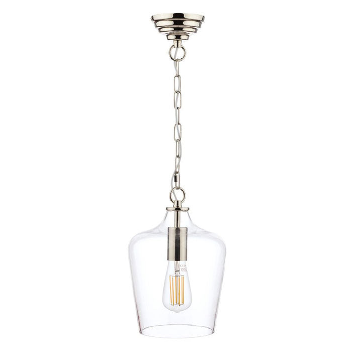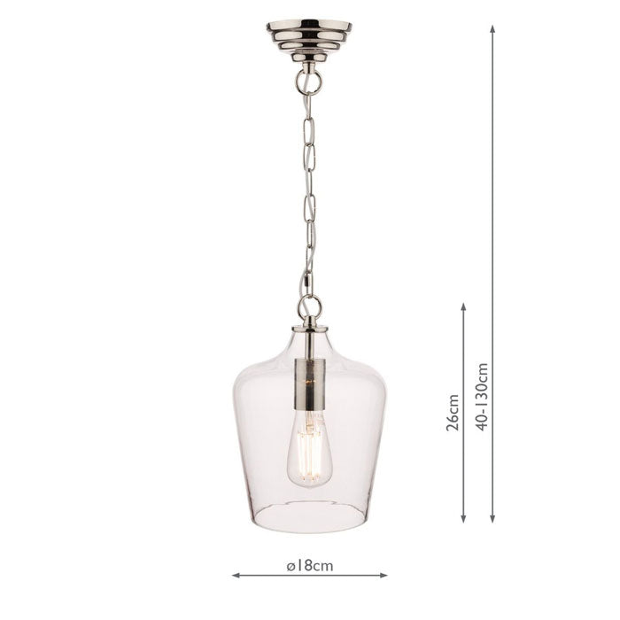 Its sleek polished chrome metalwork and clear glass bottle form bring a touch of sophistication to your kitchen, dining room or hall. Mix in a bit of flair with its adjustable height chain and matching ceiling rose. You'll be amazed at the transformation the Ockley could make to your interior despite its minimalistic design!