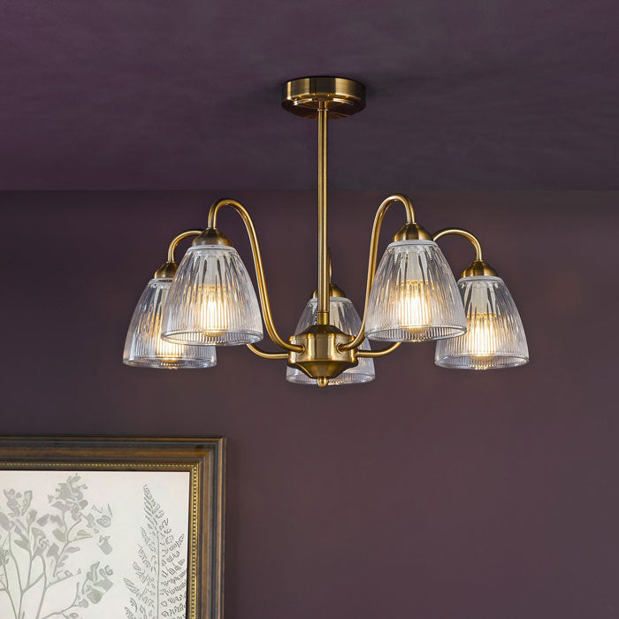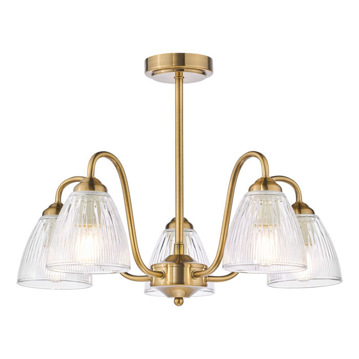 Illuminate your space with the Glynis 5 Light Semi-Flush ceiling light from dar lighting, a perfect solution for lighting low ceilings. This traditional-style fixture boasts a warm brushed bronze finish and clear ribbed glass shades, adding texture and visual interest to any room. The Glynis semi flush ceiling light creates a cosy ambience whilst providing ample illumination for your living areas. For those preferring a more contemporary look, a nickel finish option is available. Versatile in design, this light complements various home decor styles, from classic to modern. Complete your lighting scheme with matching wall and table lamps, available separately. Whether you're reading, relaxing, or entertaining, the Glynis ceiling light sets the perfect mood for any occasion.