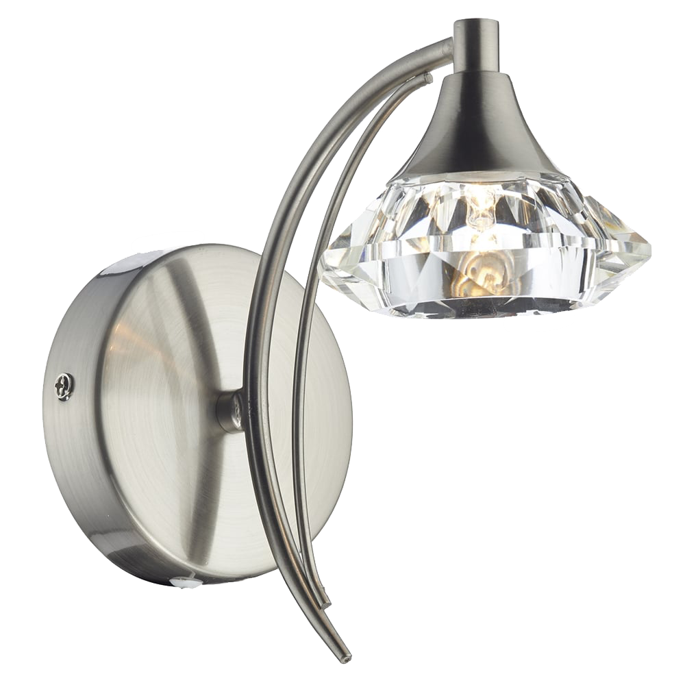 The Luther Single Wall Light by Dar has a satin chrome finish with a crystal glass faceted shade. This wall light is designed to compliment the Luther Range with it's elegant sweeping lines and faceted crystal glass shade