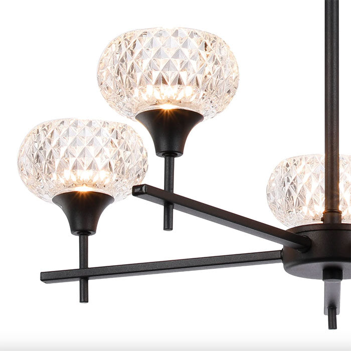 Elevate your space with the modern Deco Aria 5-Light Fixed Pendant (D0847BL). Featuring a bold satin black finish and sleek clear glass shades, this pendant blends industrial charm with a touch of sparkle. The modern design of the Aria pendant light makes it a perfect statement piece for any contemporary home or office. This fitting is IP44 rated and allows you to install it within your bathroom.