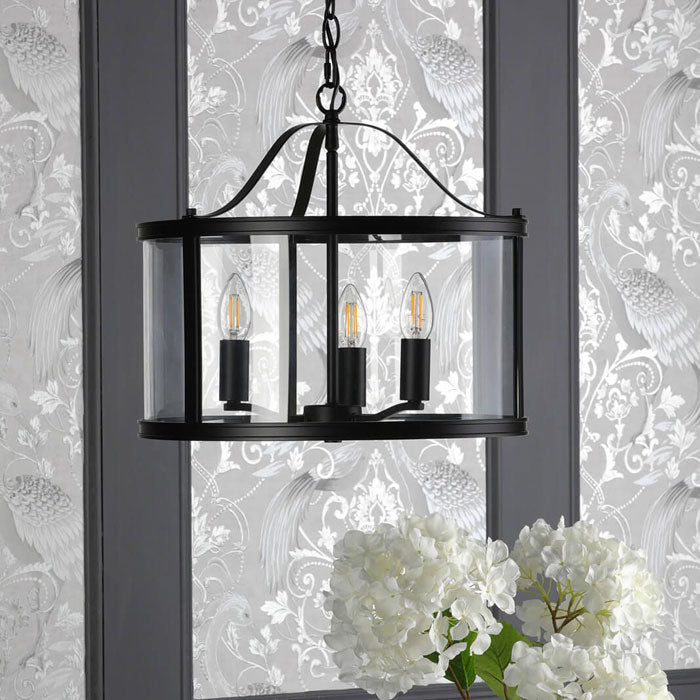 The clean-lined Laura Ashley Harrington ceiling pendant light is a graceful blend of clear glass and sleek metal. A simple, lantern-style drum-shaped case surrounds a suspended trio of lamp-holders, all in a sophisticated black finish for effortlessly elegant looks. The three light Harrington ceiling pendant is a subtle yet stylish piece to illuminate your favourite room and create a bright, inviting space.