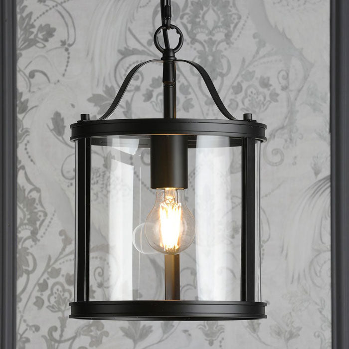 The clean-lined Laura Ashley Harrington ceiling pendant light is a graceful blend of clear glass and sleek metal. A simple, lantern-style drum-shaped case surrounds a suspended lamp holder, all in a sophisticated black finish for effortlessly elegant looks. The one-light Harrington ceiling pendant is a subtle yet stylish piece to illuminate your favourite room and create a bright, inviting space.