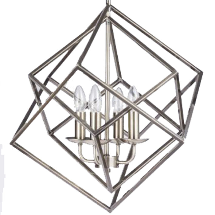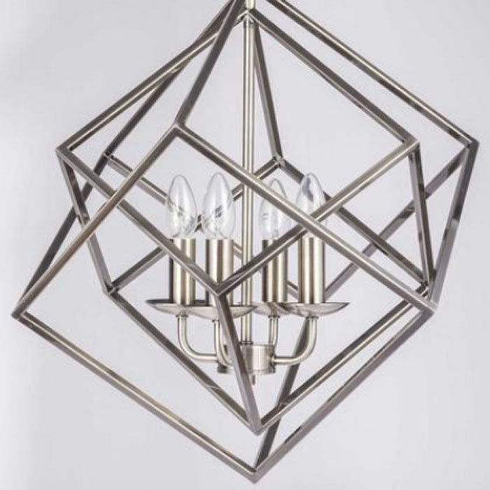 For a truly contemporary look you will be needing this unique boxed pendant light which has four light bulb holders. The striking design has a strong design and features two boxed nickel frames placed at angle inside one another which then surrounds a classic arrangement of four lights.