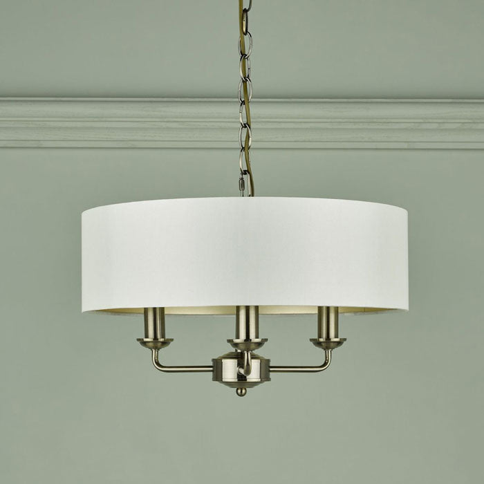 Subtle and sophisticated, the attractive Sorrento ceiling light from Laura Ashley boasts three lights on arms, all encased in a single contemporary drum shade in sleek ivory silk-effect fabric with a pearlised inner. A hanging chain falls from a round, Art Deco style, stepped ceiling rose. This 3 light pendant ceiling fitting comes in a traditional warm antique brass finish, adding grown-up atmosphere to your dining or living area.