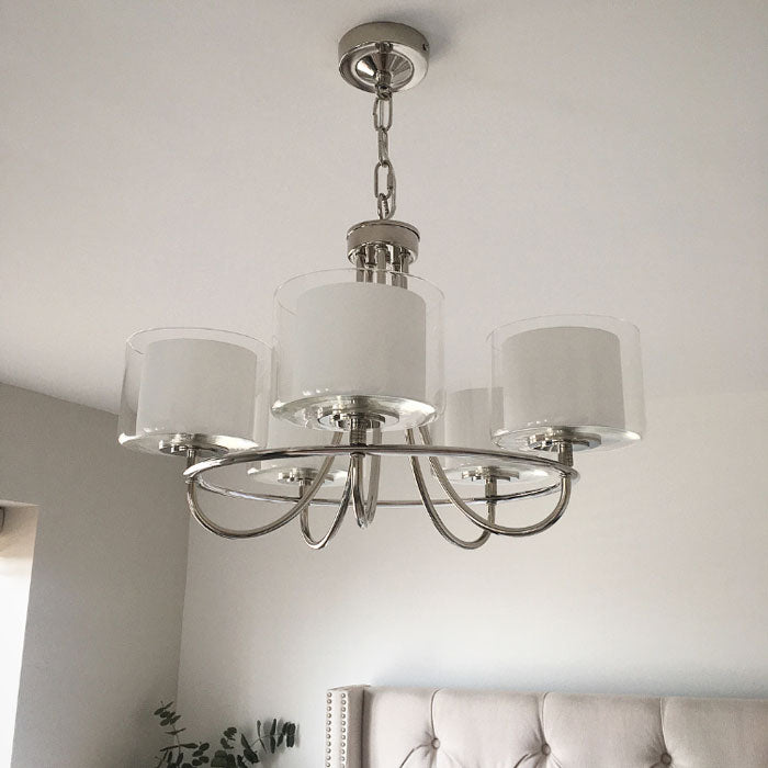 Stylish in design this five light chandelier by Laura Ashley is sure to make a stunning statement in your interior. At only £212 this fitting features five, double-layer glass shades with matt opal white inners that are designed to diffuse the light ever so beautifully.