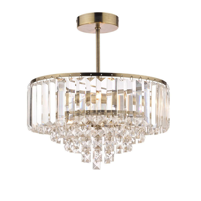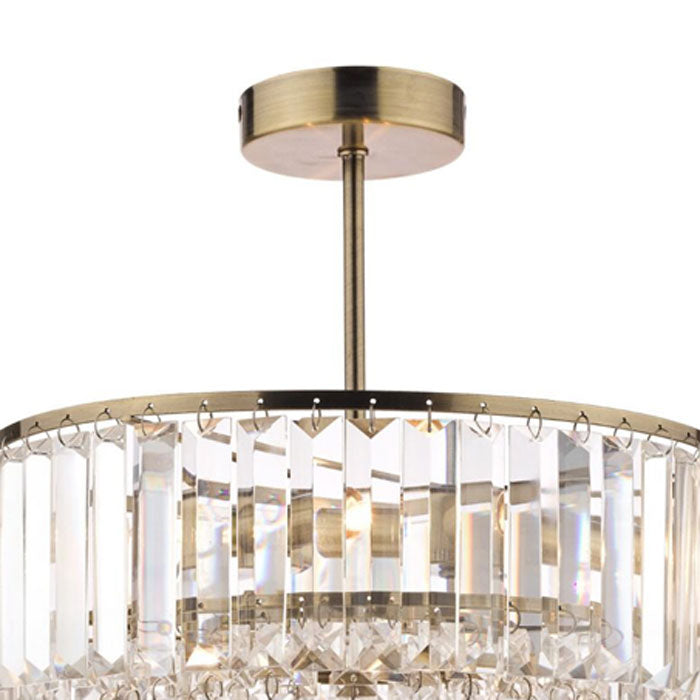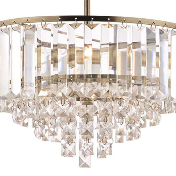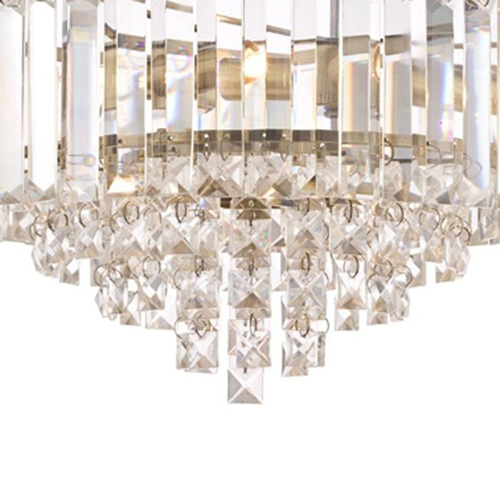 Encased around three lights is bevelled glass crystal rods that are complemented by an impressive fountain of square-cut glass droplets. The rods and droplets are all fitted to an antique brass finish frame and collectively fall to a central point.