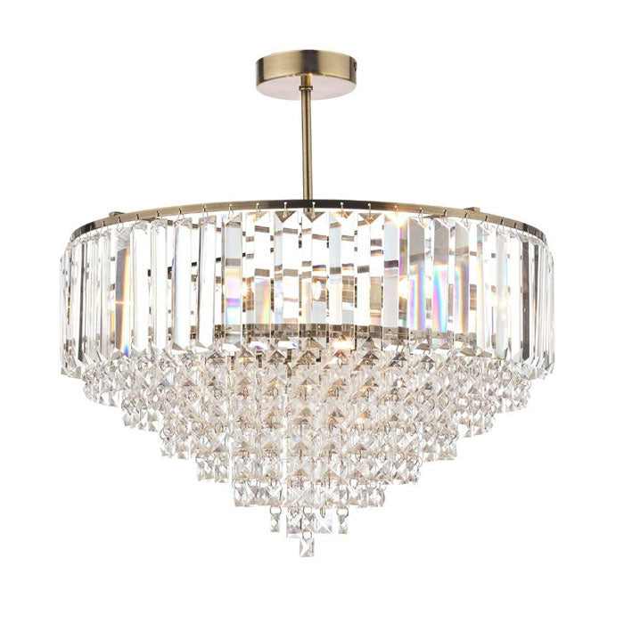 Featuring bevelled glass crystal rods combined with a glittering fountain of square-cut faceted glass droplets which fall to a central point, this ceiling light oozes luxury! All rods and droplets all suspended from a circular frame in a warm antique brass finish for an added touch of grandeur.