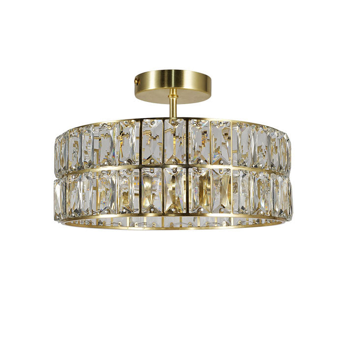 The satin brass finish radiates sophistication, while the crystal accents introduce a timeless allure. This fixture skilfully balances contemporary design with practical lighting, providing both aesthetic appeal and functionality.