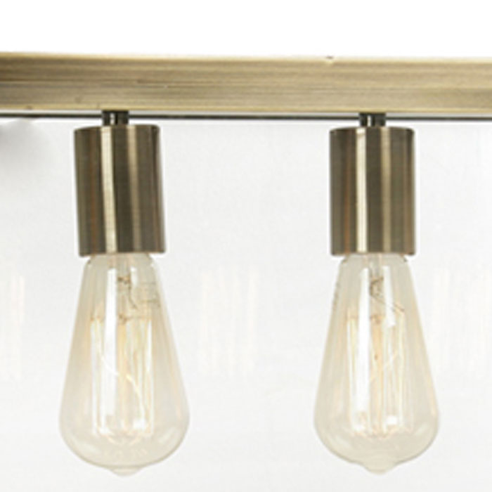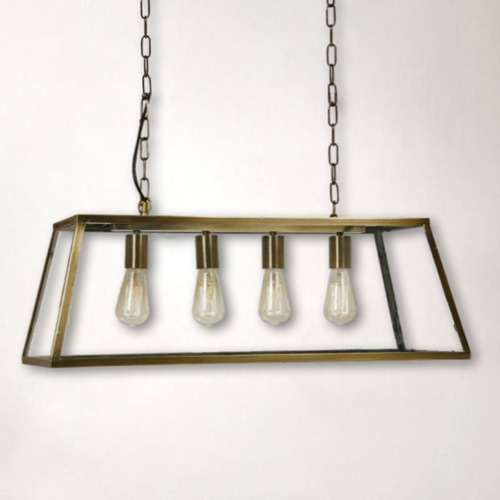 Due to the simplicity of this box frame the focus is on the four bulbs while the frame is suspended from two simple brass chains to give it a warehouse / industrial look.