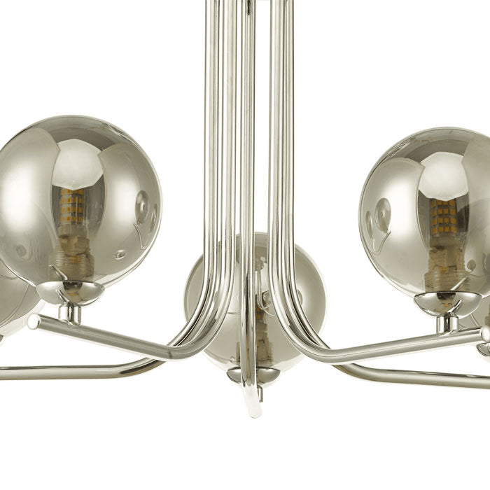 The Cradle 5 light semi-flush ceiling light is a exercise in modernist design. It is notable for the simplicity of its well-proportioned radius arms, teamed with glass orbs that appear to balance, breathtakingly, on the fine tubing.