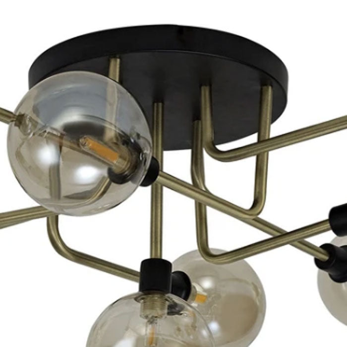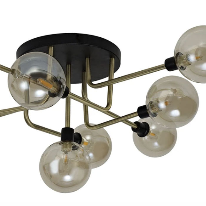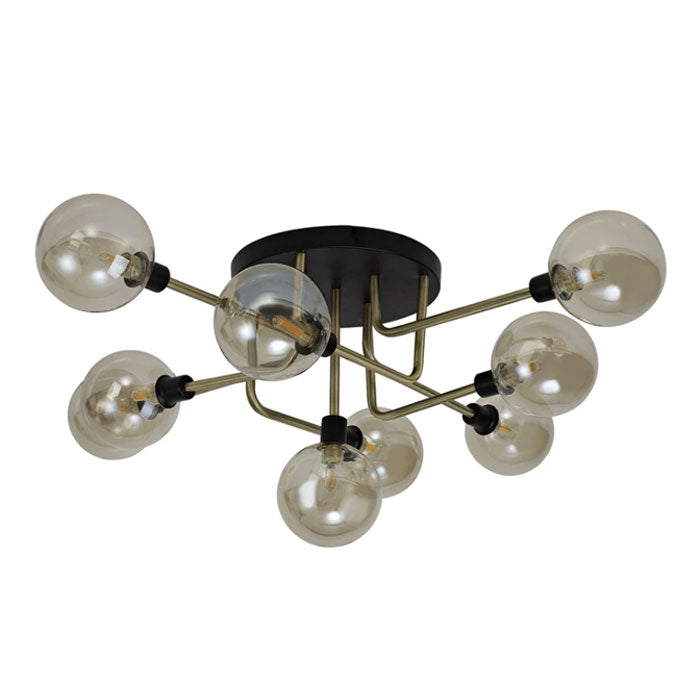 This modern ceiling fitting has industrial appeal. Nine cognac glass globes are combined with matt black and antique brass finishwork to create a designer look.