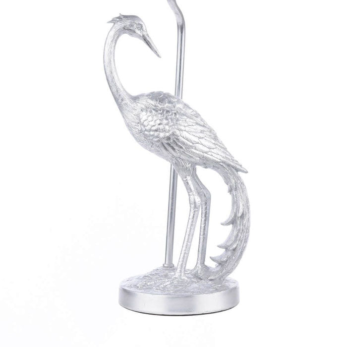 This luxuriously flamboyant table lamp features a Heron bird base which has been decorated by with real silver leaf it give it a truly rich look. To complement the base is a lampshade made in a grey cotton fabric shaped in a drum with matt silver liner and a braided grey cable and an inline switch.