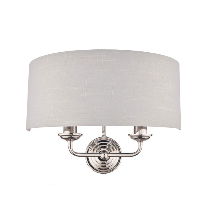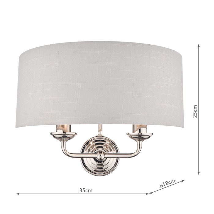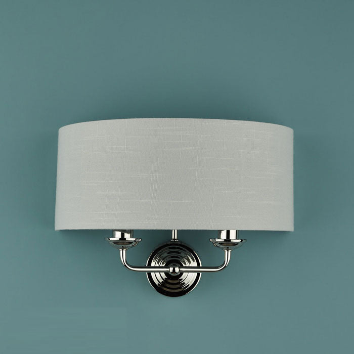 Cool and smart, the Sorrento double wall light from Laura Ashley boasts two lights on arms, both encased in a single contemporary demi-drum shade in silver slubbed linen with a metallic silver inner.