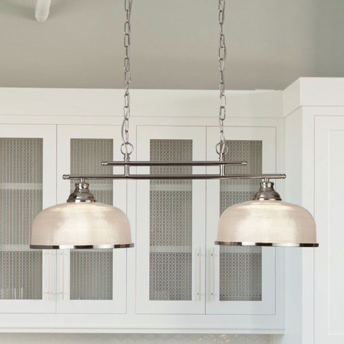 This two light ceiling bar is sure to look great over your kitchen island and comes available in two finishes. You can choose from Antique Brass (3592-2AB) for a traditional look or Satin Silver (3592-2SS) for a more modern effect.