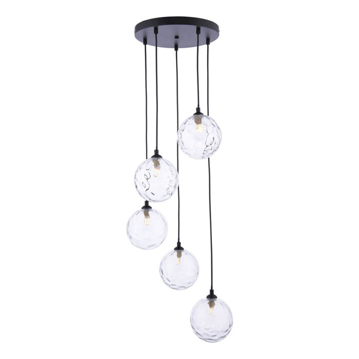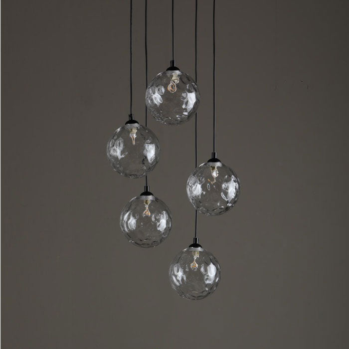 Featuring 5 spiralling oversized clear dimple glass shades this cluster pendant is sure to make an impact! The design is versatile and would be at home as a stairwell light, over a dining table or even at the side of you bed.