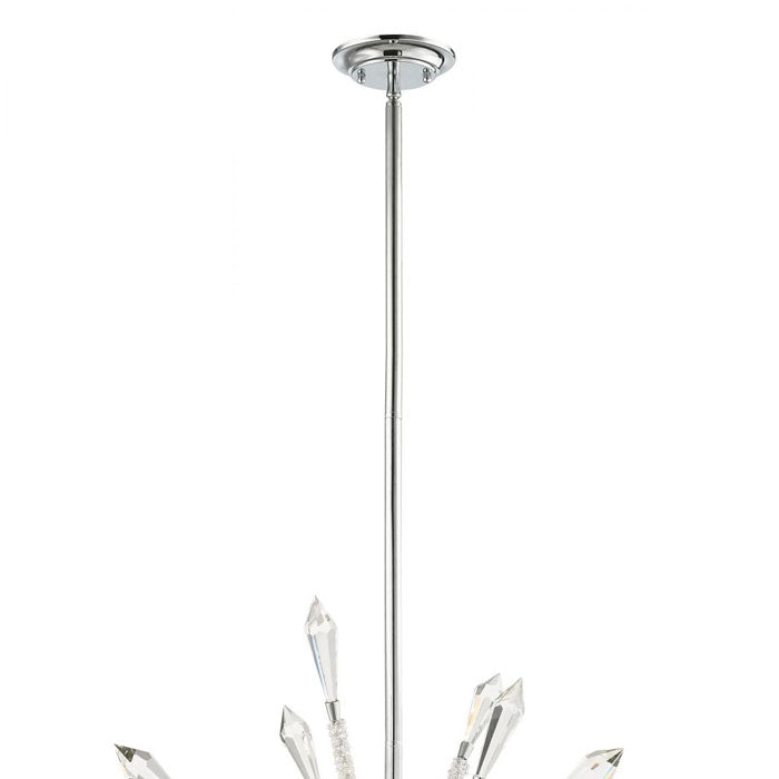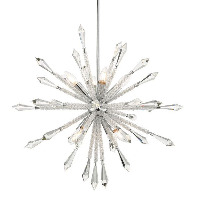 Featuring 8 arms this pendant has a 360 degree design which lets you see the starburst effect from whichever angle you look at it. Spears of chrome metalwork and crystal glass fuse together and protrude from the metal core to deliver a stunning addition to any hallway, living or dining room.