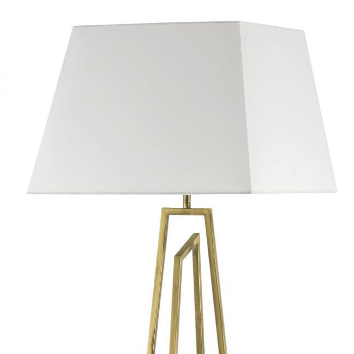 This contemporary floor lamp with it's eye catching design of two interlocking antique brass rectangular frames is sure to look great in any home.