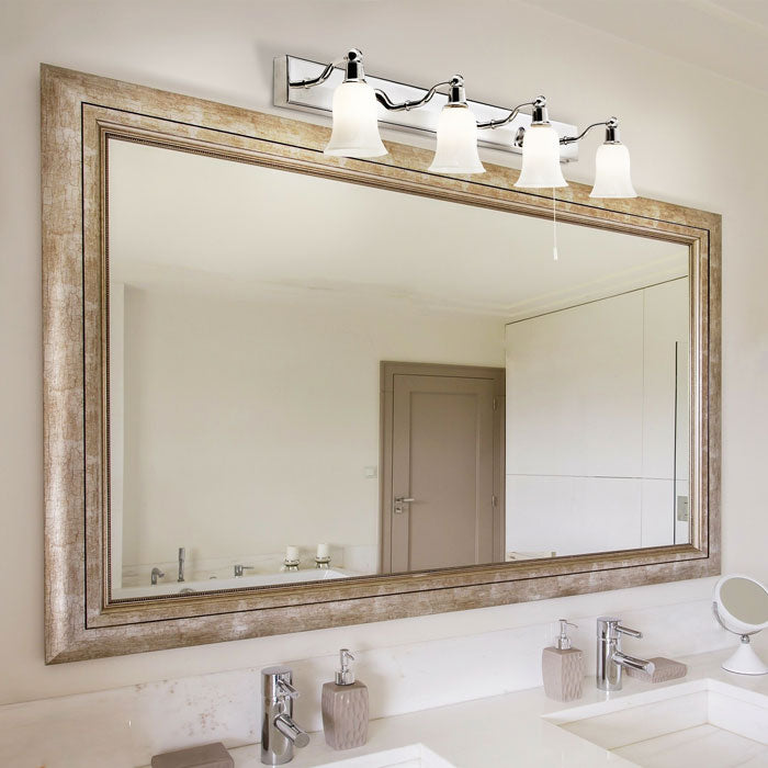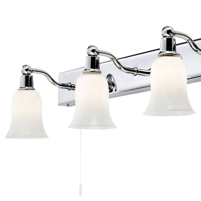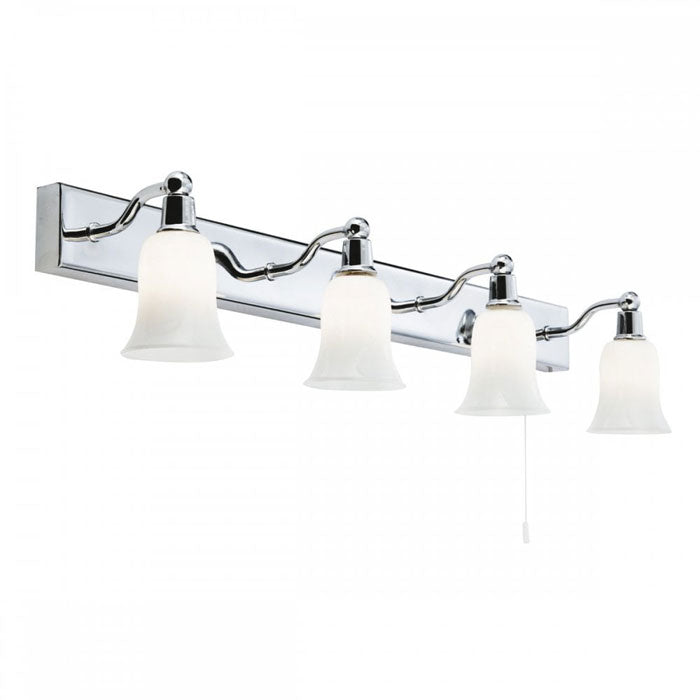 The four lights featuring opal glass shades light up the wall beautifully. The wall bar which is finished in polished chrome also comes with a easy to use pull cord and the fitting is IP44 rated and fully splashproof.