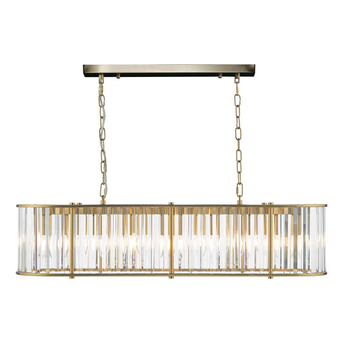 The Dar Kiran 7 Light Bar Pendant in Natural Brass and Crystal makes an immediate statement with its combination of warm metallic tones and precision-cut crystal detailing. Designed as a horizontal feature fitting, it brings both presence and polish to larger interiors.