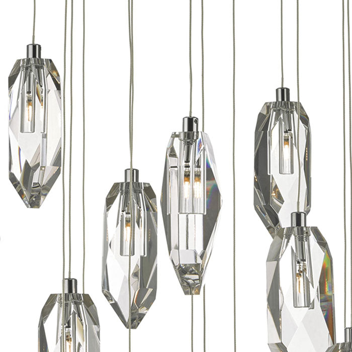 The Crystal Collection features a cluster of faceted rock crystals which cascade from a polished chrome ceiling plate.