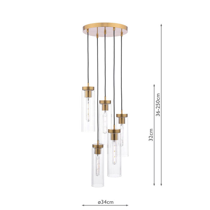 The Jodelle 5 Light Cluster Pendant Polished Bronze and Glass is a large scale cluster pendant with elegant slender ribbed glass shades. The Jodelle cluster pendant looks great hung low over a dining table or in a stairwell. The Jodelle cluster pendant features a black braided cable and is height adjustable on installation. The Jodelle cluster pendant takes five E27 (ES) bulbs (not supplied), We recommend using LED filament lamps from our range of LED bulbs.