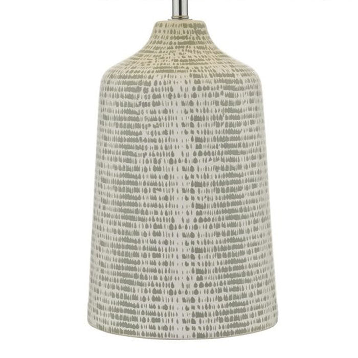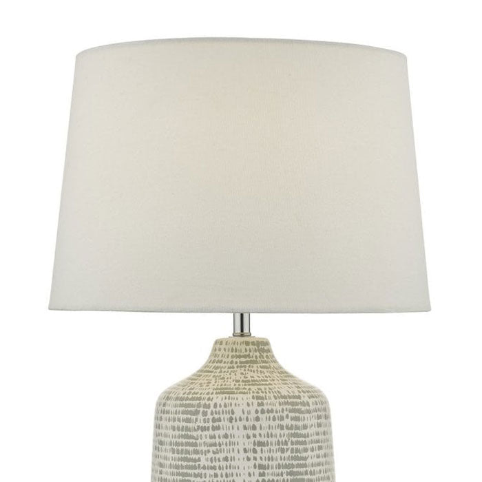 The Vondra Table Lamp VON4239 is a modern ceramic table lamp and shade with an abstract grey and white hand applied glaze. Complete with an ivory linen shade this table lamp is operated via an in line rocker switch. Perfect for any living or working space.