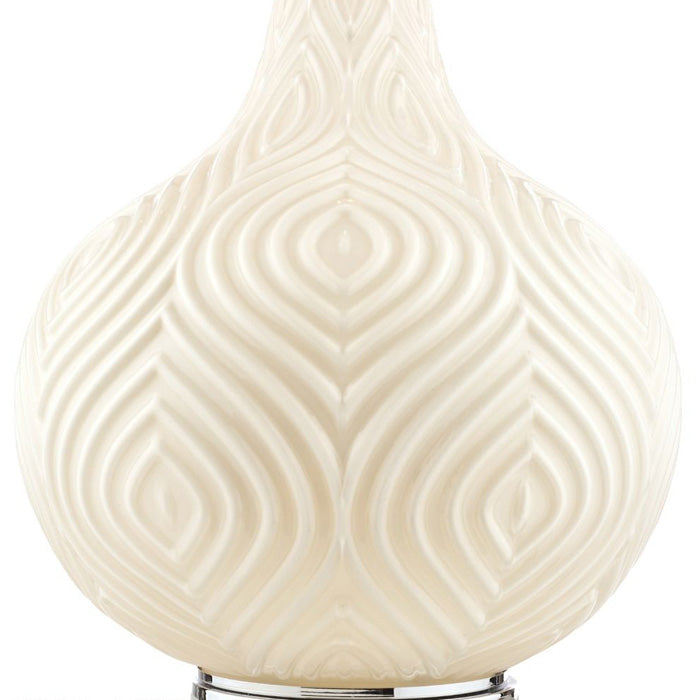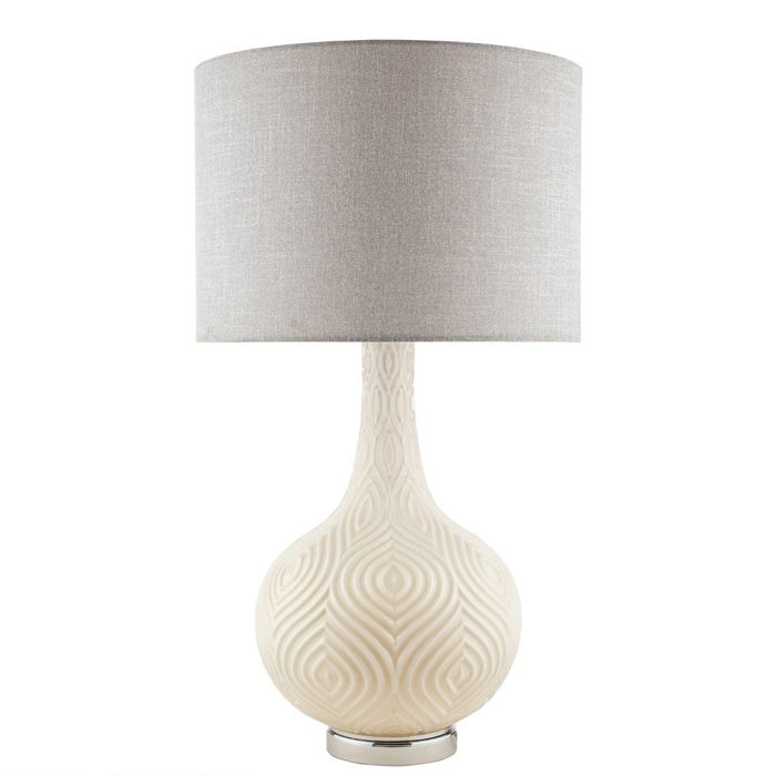 Large in form, this gorgeous table lamp by interior design brand Laura Ashley is from their latest lighting design collection. Delightfully large the grace table lamp has a bottle-shaped body that features opal glass (also known as milk glass), as the raised, ogee-patterned surface has been painted white.