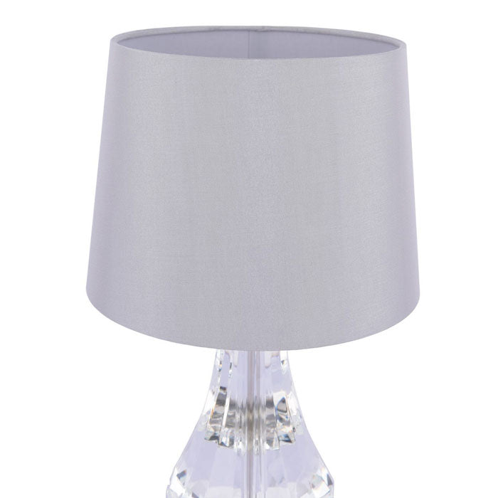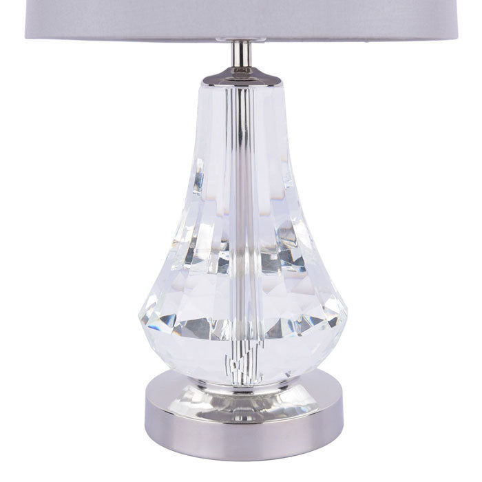 The Humby Table Lamp by Laura Ashley features stunning sparkly cut glass paired with polished finished metal and a contemporary touch on/off function. Simply touch the polished nickel base once to turn on and again to turn off.This touch lamp is a perfect bedside lamp adding a touch of glamour to your room. Expertly paired with a silver faux silk shade and luxury reflective silver inner to diffuse the light. This product has an clear cable with an inline switch. Bulb not included; takes 1 x 40W max SES.