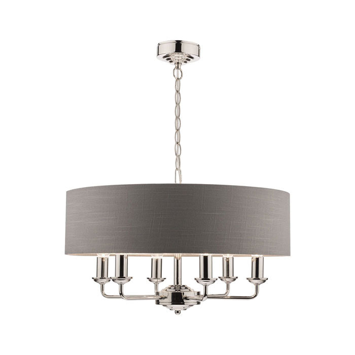 Chic and on-trend, the attractive large Sorrento ceiling light from Laura Ashley boasts six lights on arms, all encased in a single contemporary drum shade in charcoal grey slubbed linen with a metallic silver inner. A hanging chain falls from a round, Art Deco style, stepped ceiling rose. This 6 light pendant ceiling fitting comes in a modern polished nickel finish, adding grown-up atmosphere to your dining or living area.