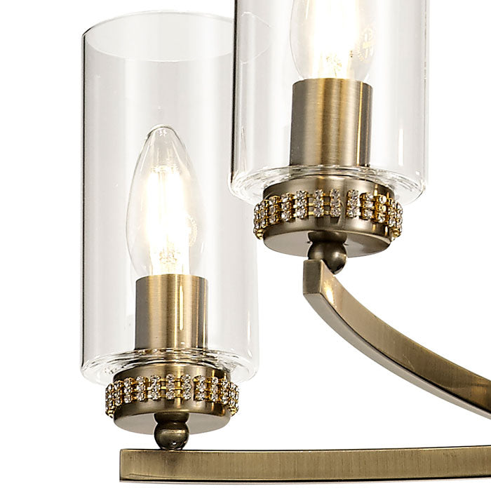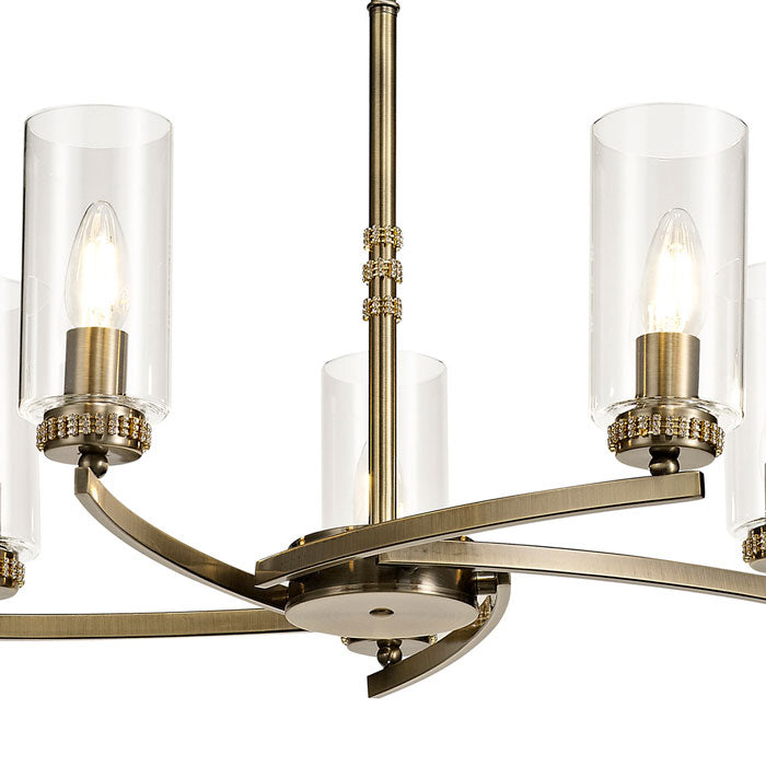 Each of the five lamp holders are surrounded by an open cylindrical clear glass, which produces an elegant light source.