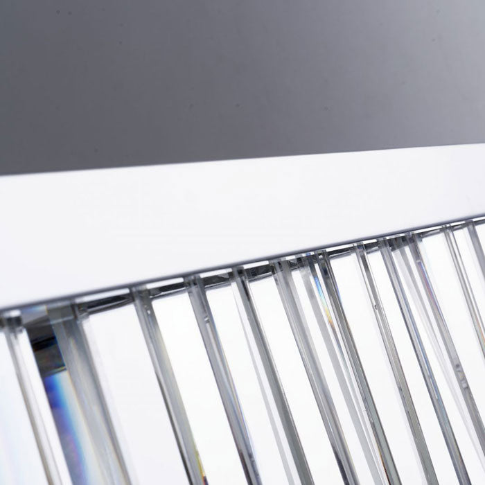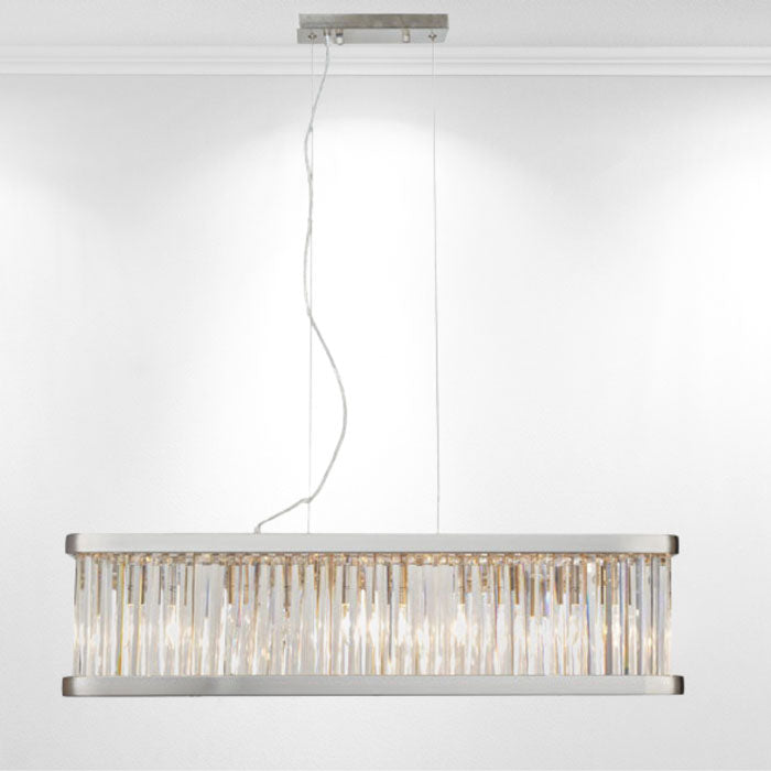 The Pandora 5 Light Rounded Rectangle in Satin Chrome is a statement ceiling light comprising of sparkling crystal bars encased in two thick antique brass bands. The elegant band of crystal reflects the light beautifully when illuminated for a glamorous lighting effect. The Pandora is fully LED Compatible and available in a number of sizes, a matching wall light and in Polished Chrome and Antique Brass.