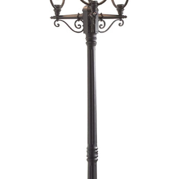 Tall in appearance it features a black lacquered aluminium frame which is traditional in appearance and supports three attractive lanterns on straight arms with detailed scrolling.