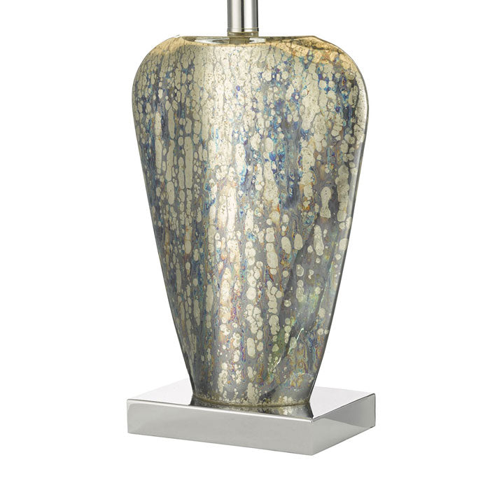 This luxury table lamp with an aged glass base and antique mercury finish complete.