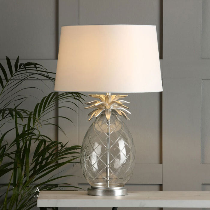 Feeling fruity? Create quirky home style with the large Laura Ashley Pineapple table lamp, and give your room some real character. The base is a pineapple shape, formed from clear, hand cut glass, and it is topped with resin pineapple leaves and tailed with a flat ring, both painted by hand in brushed chrome.